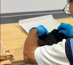 洗浄後、乾燥機をかけた後のナフキンに付着している小さなホコリ、糸屑等をカーペットクリーナーで除去する作業です。